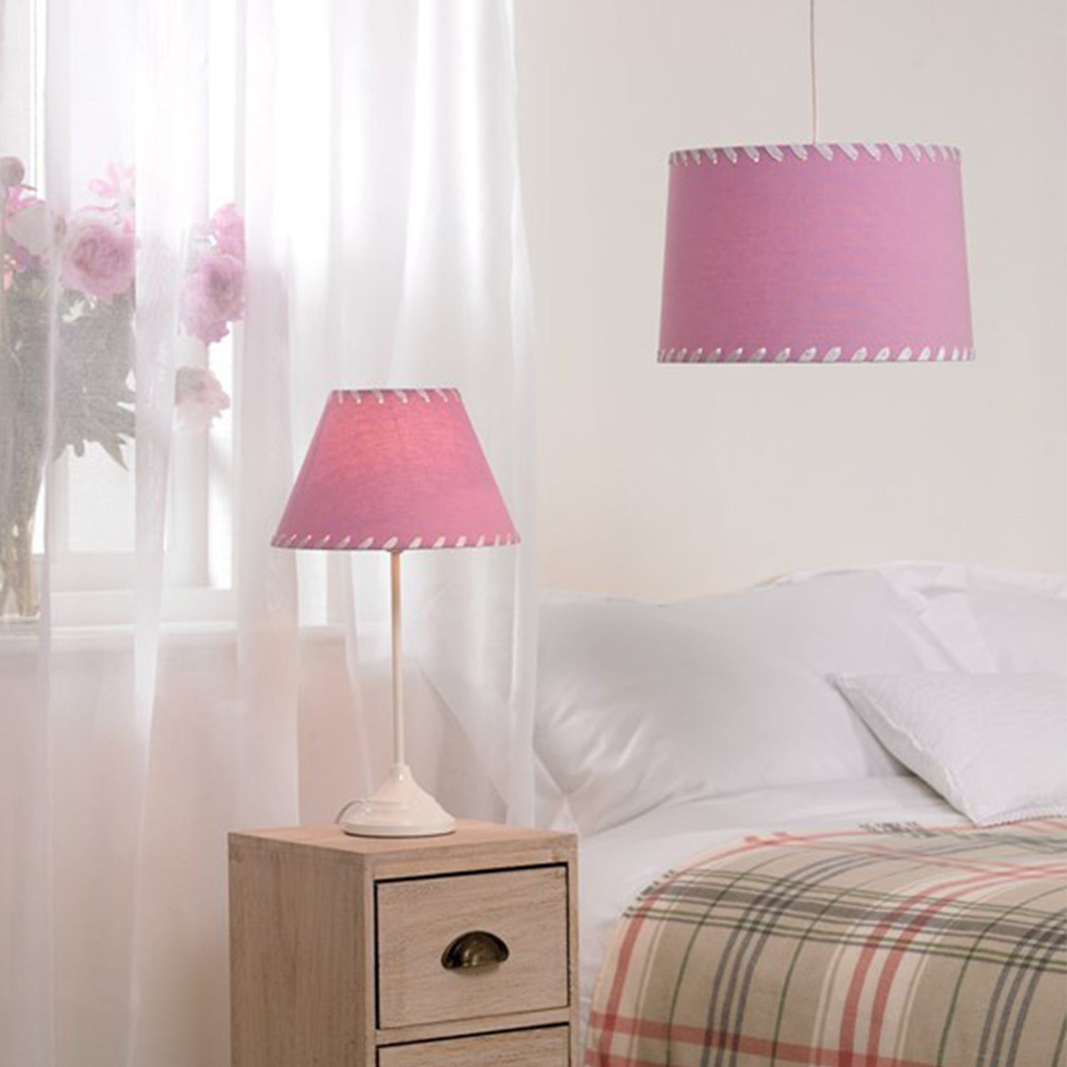 Lavender pink with pretty ribbon detailing, this lampshade would be perfect for use in children's rooms, from the early years onwards.