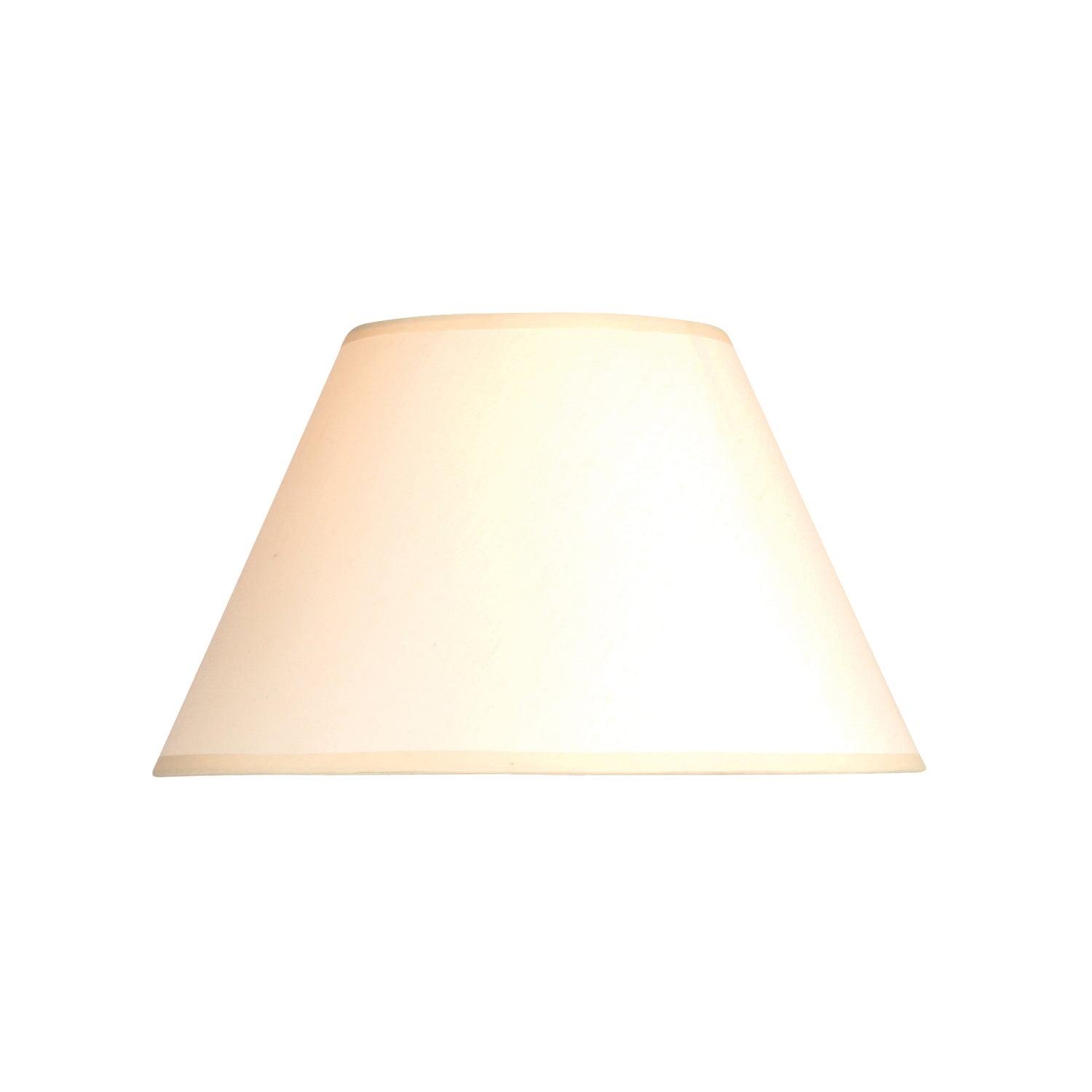A simple plain cream tapered lampshade with a clean rolled edge design with no visible tape or stitching. This lampshade benefits from a reversible gimbal meaning it can be used on lamp bases or as a ceiling pendant shade.