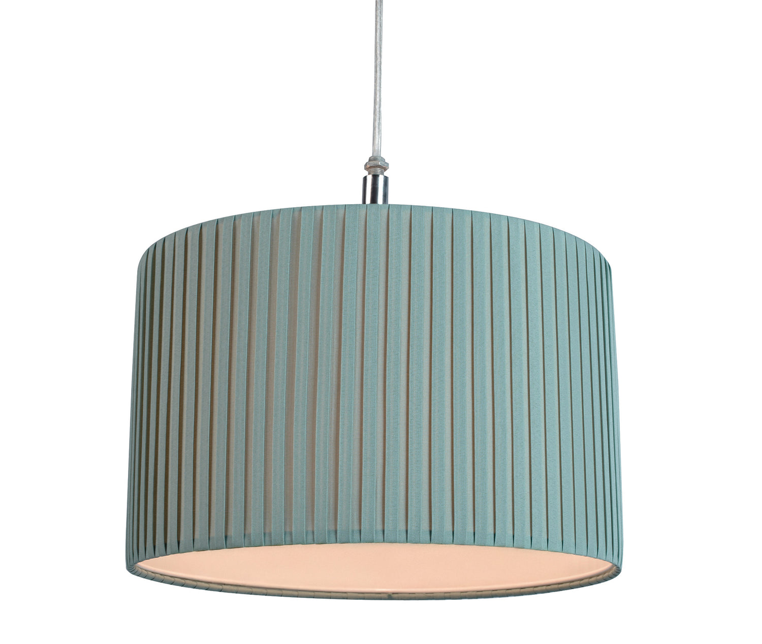 An elegant box pleated cylinder pendant lampshade in a deep duck egg green colour.